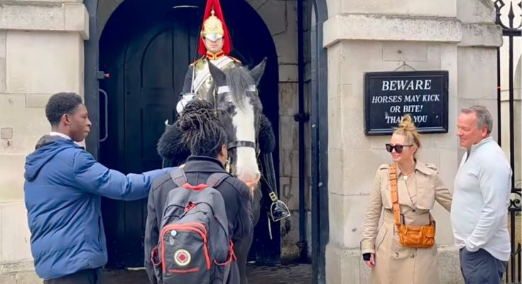 Gentleman Guards stay composed as respectful kids admire from a distance, while disrespectful kids push boundaries, shouting, grabbing reins, and testing patience.