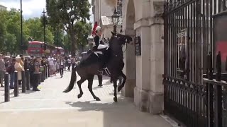 SPOOKED HORSE! Kings Guard screams at public to get to safety! Panic at Horse Guards as a spooked horse prompts the King’s Guard to urgently shout at the public to …