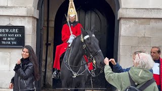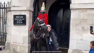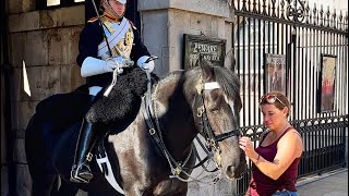 Displeasure Arises as Lady Repeatedly Touches Horse! At Horse Guards Parade in London, a lady repeatedly touches one of the King’s Guard horses — and the soldier’s displeasure is immediate!