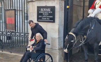 Disabled tourist strokes the horse ! A heartwarming moment unfolds as a disabled tourist gently strokes the King’s Guard’s horse. …