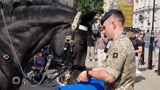 Thirsty King’s Horses are given water by a Trooper on a hot day! On a scorching day at Horse Guards, …