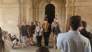King’s guard leans forward and makes the tourist let go of the reins! A tense moment at Horse Guards Parade …