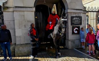 Tourists Taking Photos with the King’s Horse Guard! At Horse Guards London, tourists line up to capture the perfect photo …